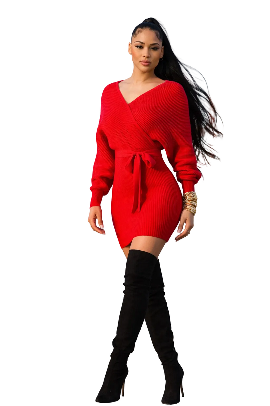 Add style and elegance to your wardrobe with the Wrap Sweater Dress. Its wrap design flatters all body types, and its v-cut in the back gives it a modern edge. Knit material keeps you warm during the cooler months, while the tie waist provides a versatile fit. Perfect for any fall or winter event.